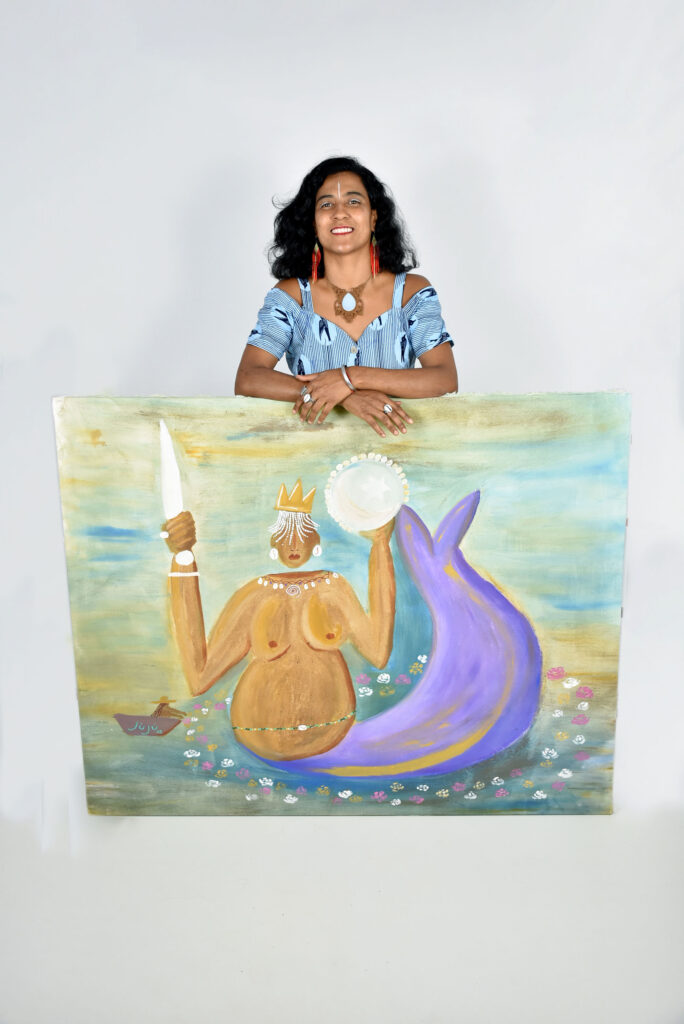 Jùjú Nsaa é mãe de Aruã e Akíndayo, artista e arte-educadora. Em seus traços, memórias e ancestralidades se fazem presentes em simbologias e mitologias que brotam de suas vivências e de seu conhecimento das raízes afro originárias. Suas criações são um diálogo íntimo com sua própria vida — corpos, mares e luas se entrelaçam em gestos de escuta e liberdade. As cores da terra, lilases, amarelos, verdes e azuis evocam o equilíbrio entre força e sensibilidade, o movimento do sagrado e o ciclo da natureza.
