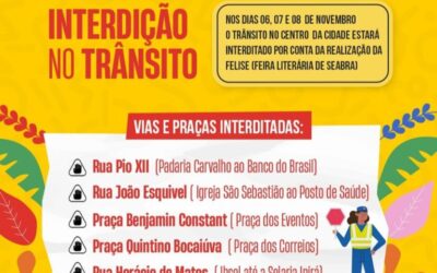 Bloqueios ocorrem entre os dias 6 e 8 de novembro em ruas e praças do centro da cidade. Em comunicado, a Prefeitura de Seabra informou que o trânsito no centro da cidade será interditado entre os dias 6 e 8 de novembro, durante a realização da FELISE – Festa Literária de Seabra 2025. Segundo o […]